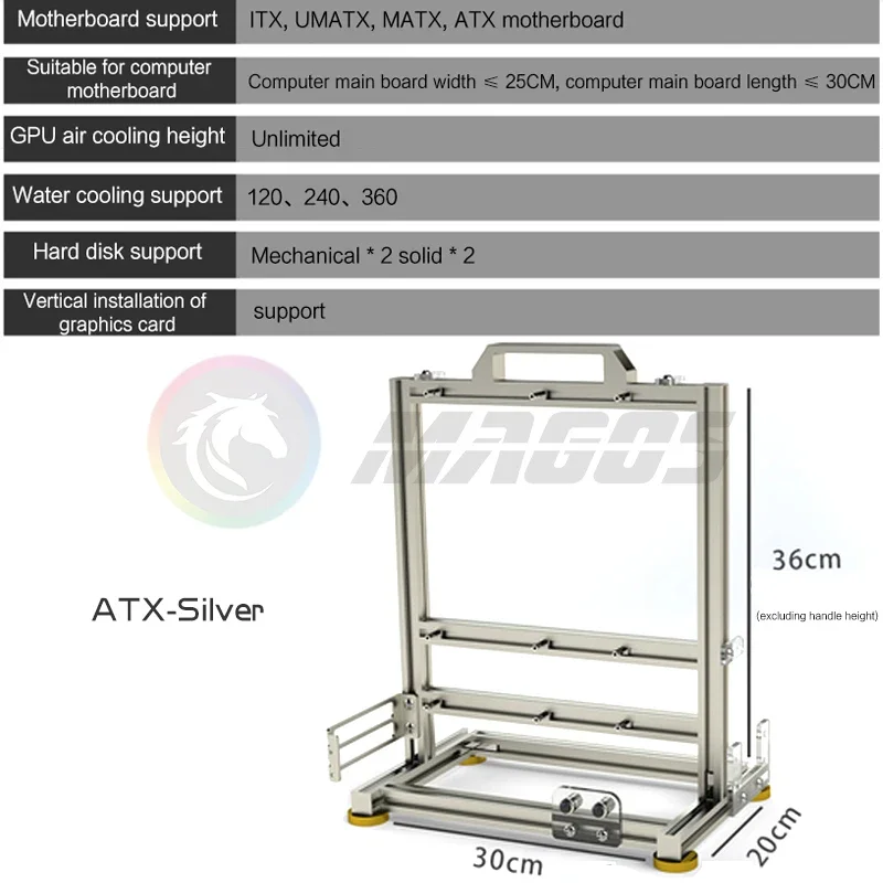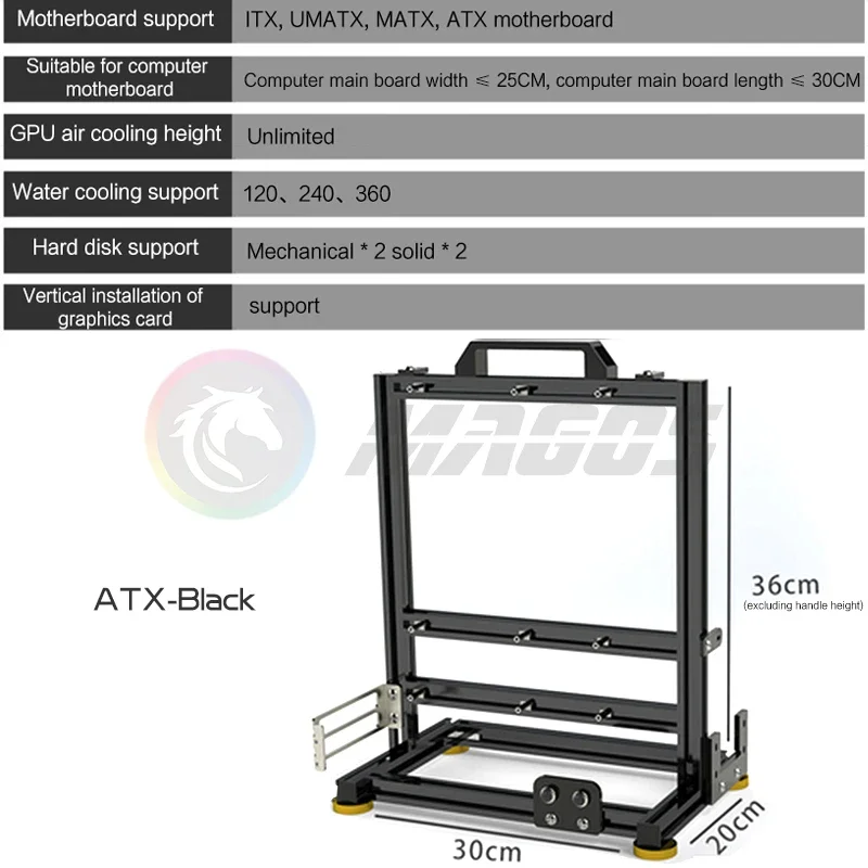 Mein DIY Gamers Cabinet ist ein offenes Aluminium-Frame-Gehäuse für kompromisslose Builds – leicht, stabil und gebaut fürs Modding. Ob ATX, Micro-ATX oder ITX: Du bekommst maximale Zugänglichkeit, hervorragende Belüftung und eine Bühne für dein Hardware-Showcase. Vertical-GPU wird unterstützt (mit Riser, optional), das ATX-Netzteil sitzt unten für eine saubere Gewichtsverteilung. Perfekt für Custom-Wasserkühlung, Luftkühler ohne Höhenlimit und kreative Kabelwege.